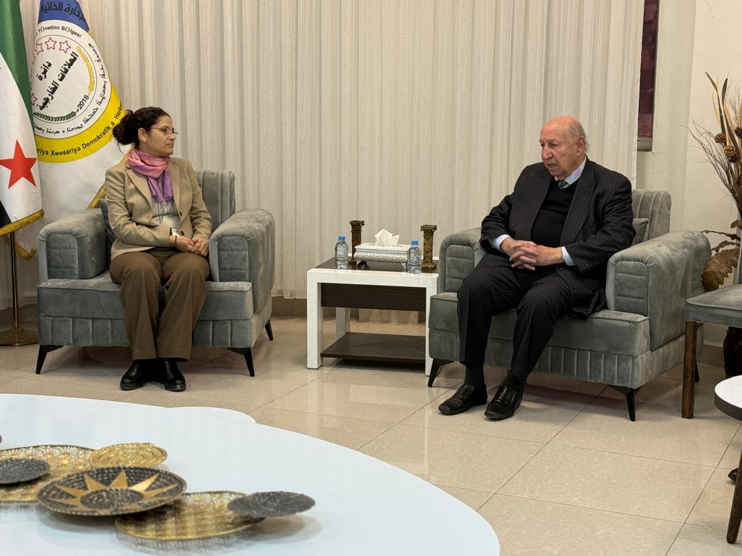 استقبلت دائرة العلاقات الخارجية في الإدارة الذاتية لشمال وشرق سوريا، اليوم الأحد 28 كانون الأول 2025، السياسي الكردي الدكتور عمر شيخموس في مقرها بمدينة قامشلو، وكان في استقباله الرئاسة المشتركة للدائرة السيدة إلهام أحمد والسيد فنر الكعيط، إلى جانب نائبة الرئاسة المشتركة السيدة كلستان علي، وعضو الهيئة الإدارية السيد خالد إبراهيم، وممثل الإدارة الذاتية في دمشق الدكتور عبد الكريم عمر، وممثل الإدارة الذاتية في دول الخليج العربي السيد سيهانوك ديبو.