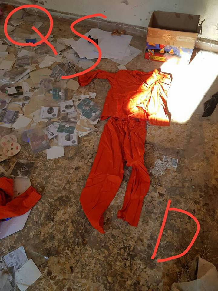 ونشر مصطفى بالي المتحدث الاعلامي باسم “قسد” على صفحته الشخصية في الفيسبوك صور لمكان تظهر فيها الألبسة البرتقالية التي كان التنظيم يُلبسها لضحاياه اثناء عمليات الإعدام، كما تضمنت الصور آثار لشرائط التصوير الفوتوغرافية وحاملات الكاميرات بالاضافة الى اقراص الـ “DVD”.