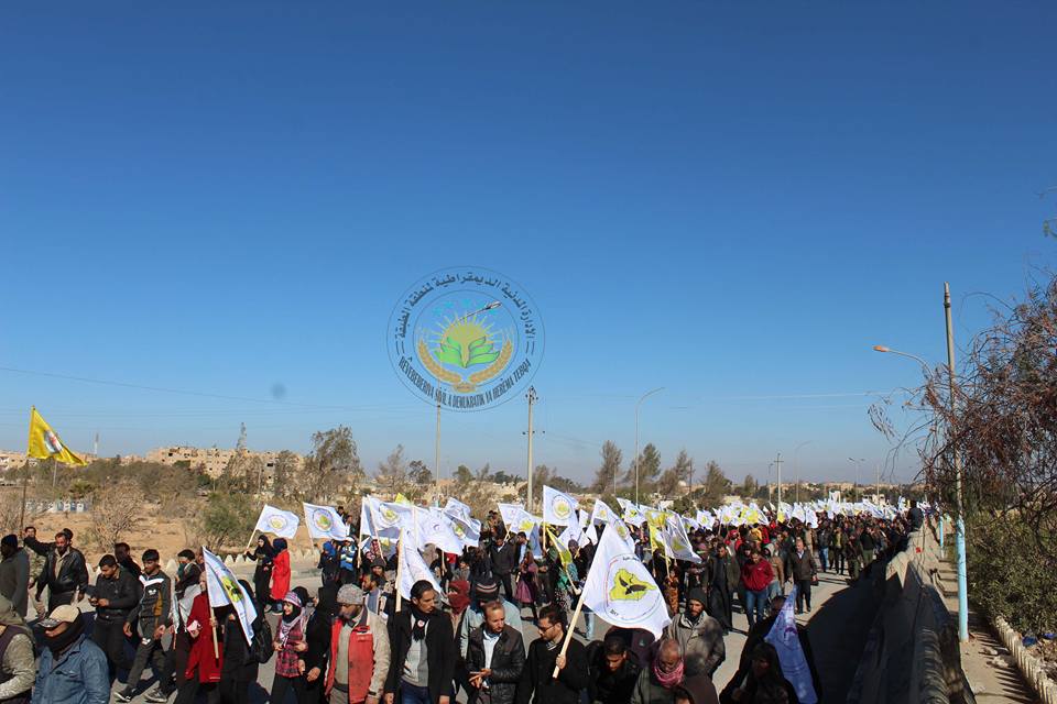 انتهت المسيرة بالقرب من دوار العلم في الجهة الغربية من مدينة الطبقة حيث قرأت هناك الرئيسة المشتركة للمجلس التشريعي بياناً رسمياً باسم الإدارة المدنية الديمقراطية لمنطقة الطبقة وباسم كافة مكونات منطقة جاء فيه: إن قوات سوريا الديمقراطية هي القوات الوحيدة التي قاتلت الإرهاب ووحدت كافة مكونات الشعب السوري في شمال سوريا حين اصطف الجميع في خندق واحد وانتصروا على داعش الإرهابية في الطبقة والرقة وريف ديرالزور في الوقت الذي كان فيه النظام الخائن يسلم القطعات العسكرية في الرقة الواحدة تلو الأخرى لمجرمي داعش حيث قام هؤلاء بذبح أبناء وطننا بأبشع الوسائل الاجرامية و إن هذه التصريحات لا تخدم ولا تقدم أي حل للأزمة السورية .