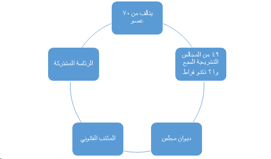 – (49) عضواً من المجالس التشريعية في مناطق الإدارات الذاتية والمجالس المدنية, و(21) عضواً من التكنوقراط تم التوافق عليهم من خلال اللجنة التحضيرية ومناقشة الإدارات الأخرى.