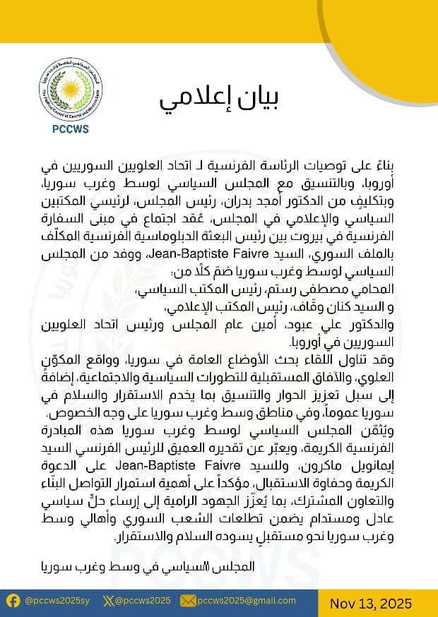 جاء هذا اللقاء بناءً على توجيهات الرئاسة الفرنسية وتوصياتها الخاصة بتجمع العلويين السوريين في أوروبا، وبالتنسيق الكامل مع المجلس السياسي المذكور.