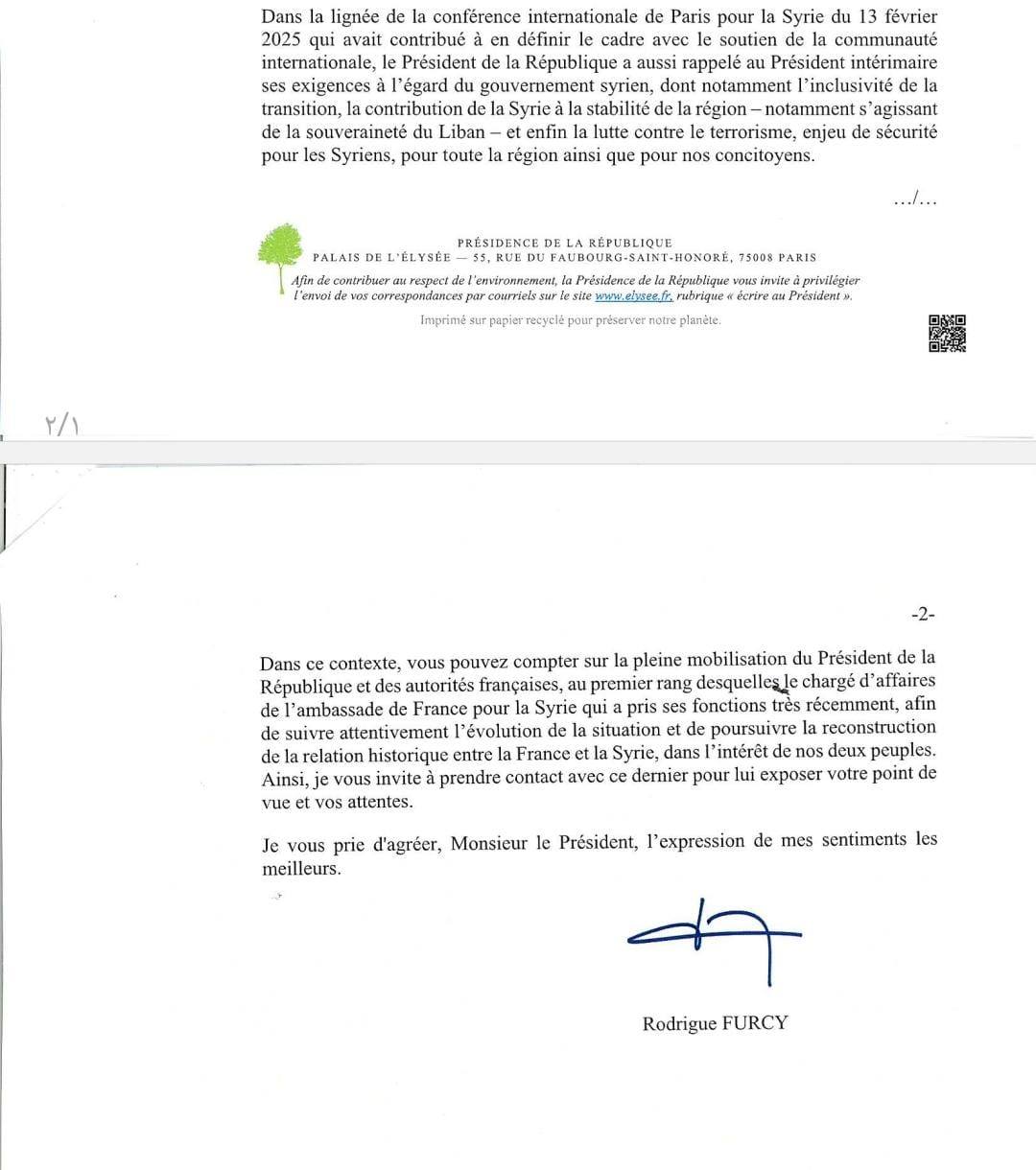 فيما يلي نص رد الرئاسة الفرنسية على رسالة للمكون العلوي
