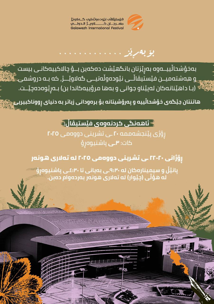تنطلق الخميس المقبل 20/11/2025 الدورة 28 لمهرجان گلاويژ الثقافي الدولي على قاعة دار الفن بمحافظة السليمانية بإقليم كردستان، بمشاركة العشرات من الكتاب والشعراء والشخصيات الاكاديمية والثقافية من مختلف دول العالم والعراق واقليم كوردستان.