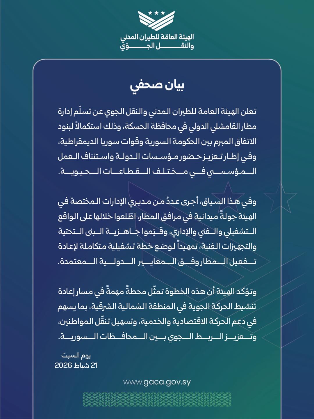 أعلنت الهيئة العامة للطيران المدني والنقل الجوي في سوريا تسلمها إدارة مطار القامشلي الدولي في محافظة الحسكة بغرب كردستان (شمال شرق سوريا)، وذلك استكمالاً لبنود الاتفاق المبرم بين الحكومة السورية المؤقتة وقوات سوريا الديمقراطية “قسد”.