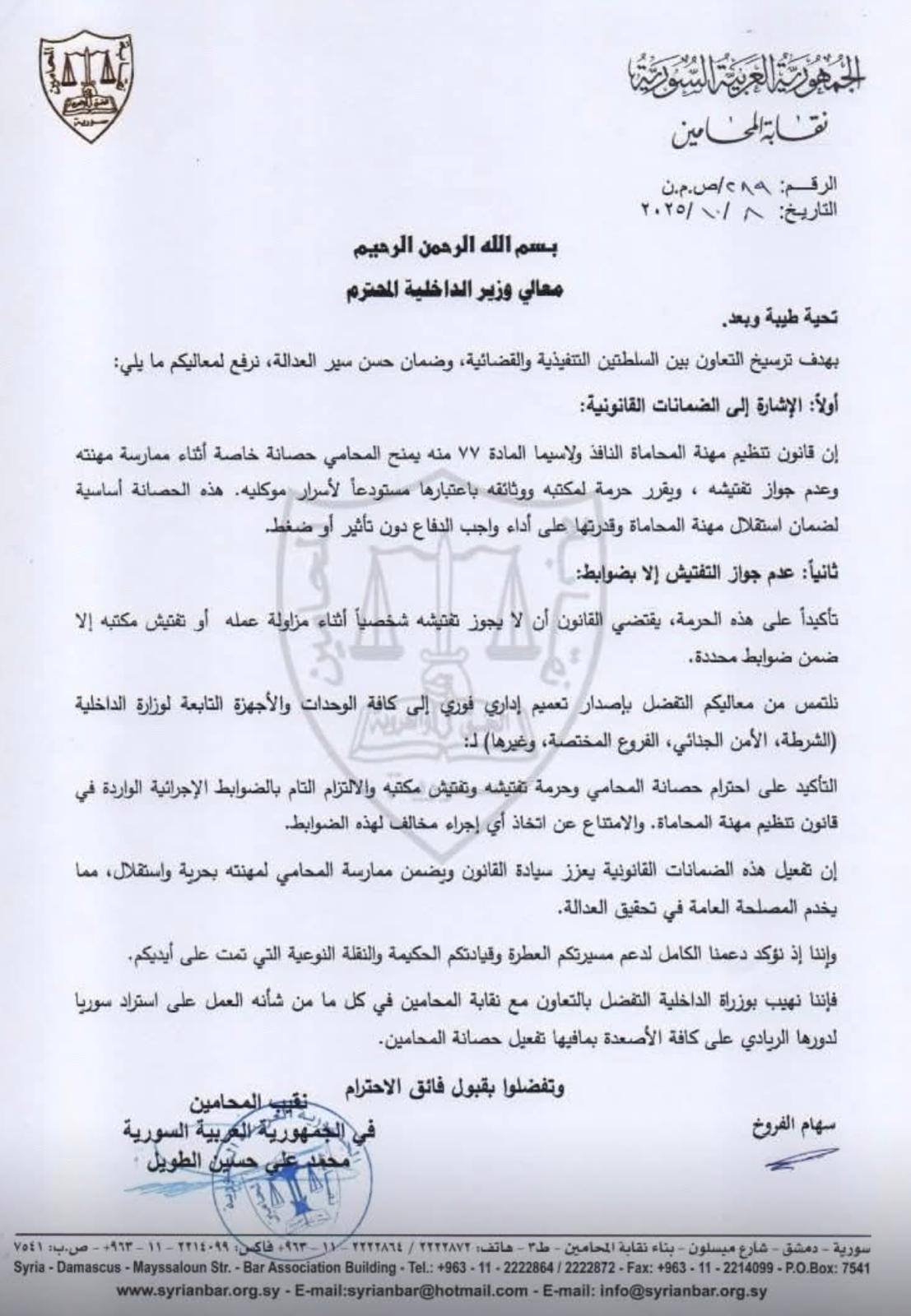 أكدتْ وثيقةٌ رسميةٌ صادرةٌ عن نقيبِ المحامينَ في سورية بتاريخِ ٨ تشرينَ الأولِ ٢٠٢٥، والموجّهةِ إلى وزيرِ الداخليةِ، أن النقابةَ رصدتْ تكرارَ حالاتِ تفتيشِ المحامينَ أثناءَ مزاولتِهم مهنتَهم، في خرقٍ واضحٍ للمادةِ (٧٧) من قانونِ تنظيمِ مهنةِ المحاماةِ، التي تكفلُ للمحامي الحريةَ والاستقلالَ وتحظرُ تفتيشَه أو ملاحقتَه إلّا وفقَ الأصولِ القانونيةِ.