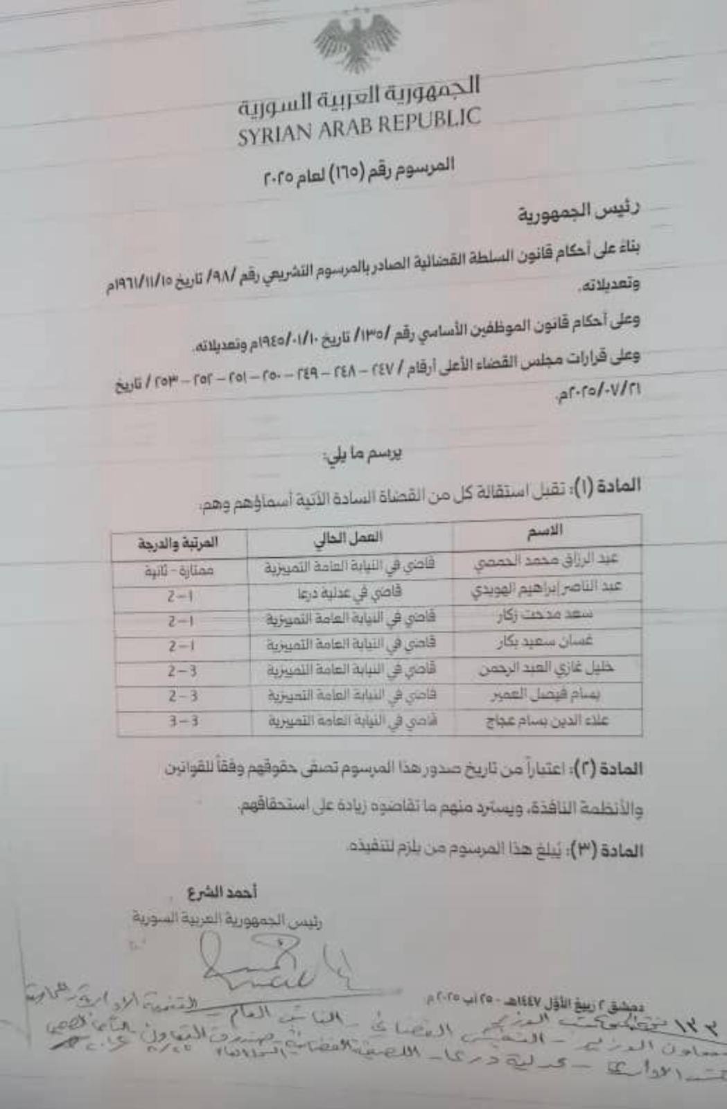 – المرسومُ رقم ١٦٥ استناداً إلى قرارِ المجلسِ بتاريخِ ٢١ تموزَ ٢٠٢٥، بقبولِ استقالةِ سبعةِ قضاةٍ من النيابةِ العامةِ التمييزيةِ، وقاضٍ من عدليةِ درعا.