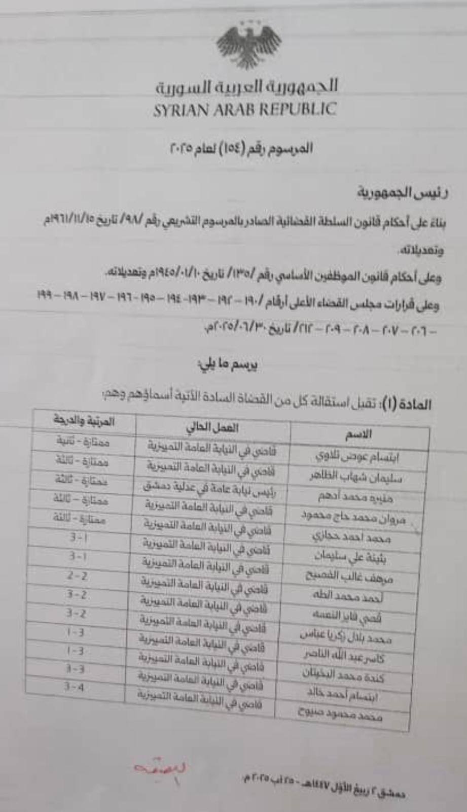 – المرسومُ رقم ١٦٣ الصادرُ بناءً على قرارِ المجلسِ بتاريخِ ١٤ تموزَ ٢٠٢٥، بقبولِ استقالةِ خمسةِ قضاةٍ من النيابةِ العامةِ التمييزيةِ، إضافةً إلى قاضيينِ من عدليّتَي ديرِ الزورِ وحلبَ.