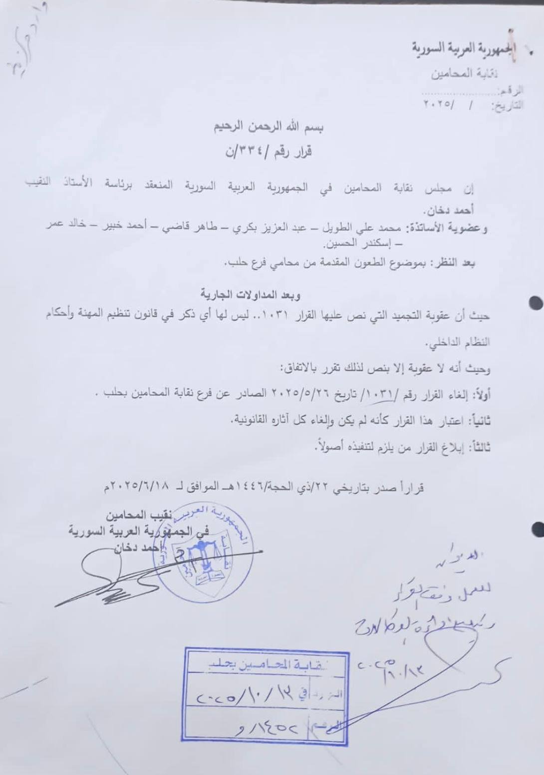 بتاريخِ ٢٦ أيارَ ٢٠٢٥، أصدرَ فرعُ نقابةِ المحامينَ في حلبَ القرارَ رقم ١٠٣١ القاضيَ بتجميدِ عضويةِ عددٍ من المحامينَ.