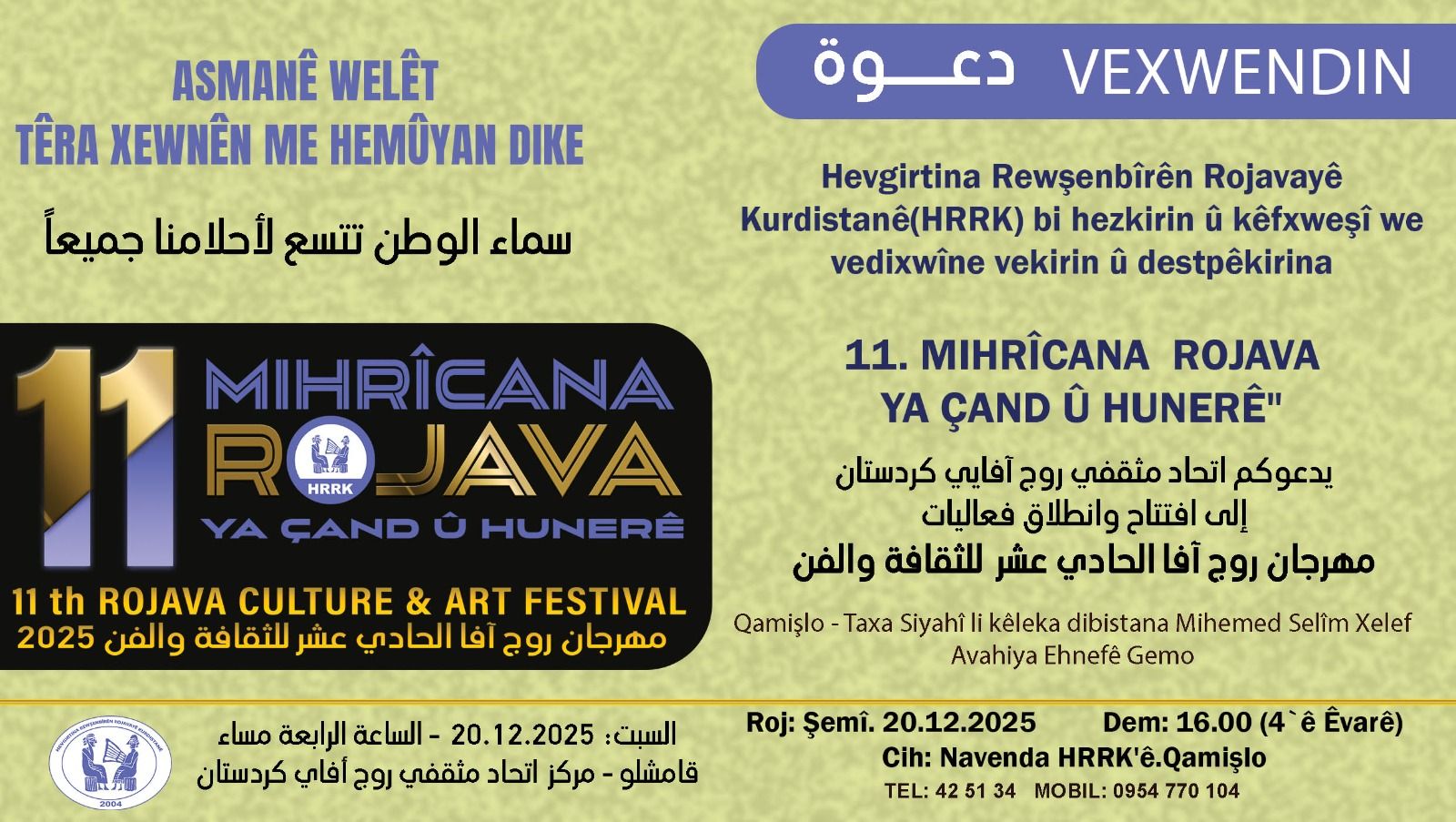 بمشاركة واسعة انطلقت فعاليات مهرجان روج آفا الحادي عشر للثقافة والفن في مركز اتحاد مثقفي روج آفا كردستان (HRRK) بمدينة قامشلو؛ وذلك يوم السبت 20 كانون الأول 2025 تحت شعار “سماء الوطن تتسع لأحلامنا جميعاً”.
