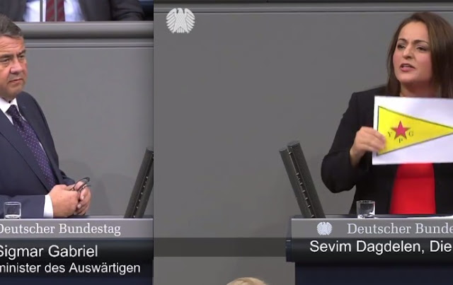 وانتقدت داغدلن، غابرييل، الذي دافع عن حظر العلم، واتهمته بالنفاق عند إرسال الحكومة الجيش الألماني لقتال “داعش” مع الأمريكيين، ثم تجريم الوحدات الكردية في ألمانيا، الذين من المفترض أنهم يقاتلون مع التحالف الدولي بقيادة الولايات المتحدة، طالبة منه الإجابة عن سؤال فيما إذا كان حظر علم “واي بي جي” صحيحاً في ألمانيا مع أنهم يقاتلون سوية في سوريا، سيما وأنه ليس موجوداً في أي من لوائح المنظمات الإرهابية.