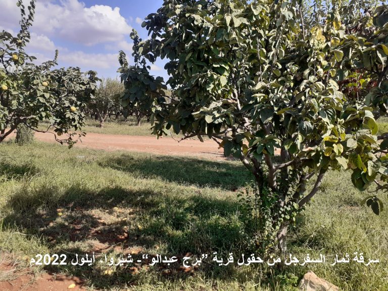– أقدم مسلّحون ومستقدمون مقربون منهم على سرقة انتاج السفرجل من (/150/ شجرة لـ عادل خليل حسن، /500/ شجرة لـ عبد الحميد كلاحو، /300/ شجرة لـ طاهر كلاحو، /100/ شجرة لـ نظمي سيدو) في قرية “برج عبدالو”- شيروا، وفي بلدة باسوطة وقرية عين دارا أيضاً، حيث تطال السرقات أيضاً حقول الرمّان في تلك القرى؛ أمام أعين متزعمي الميليشيات والاستخبارات التركية.