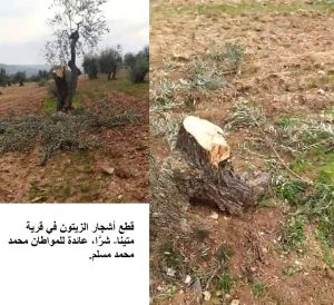 وقامت بقطع مئات أشجار الزيتون بشكلٍ جائر، ومعظم الأشجار الحراجية في محيط القرية، منها شجرة سنديان معمّرة لعائلة سليمان، وغابة وادي متينا- قطمة، وحوالي /80/ شجرة زيتون عائدة للمواطن “محمد محمد مسلم” بشكلٍ شبه كامل، وحوالي /15/ شجرة صنوبرية كبيرة عائدة لـ “إبراهيم مسلم”؛ وكذلك تم قلع مئات أشجار الزيتون بمساحة حوالي /6/ هكتار تقريباً بُغية إنشاء قاعدة عسكرية تركية على مرتفعٍ بين قريتي “كفرجنة، متينا” وهي عائدة لعائلتي “علي آغا – متينا، حمدوش – كفرجنة”. بالإضافة إلى الرعي الجائر لقطعان المواشي بين حقول الزيتون والأراضي الزراعية.