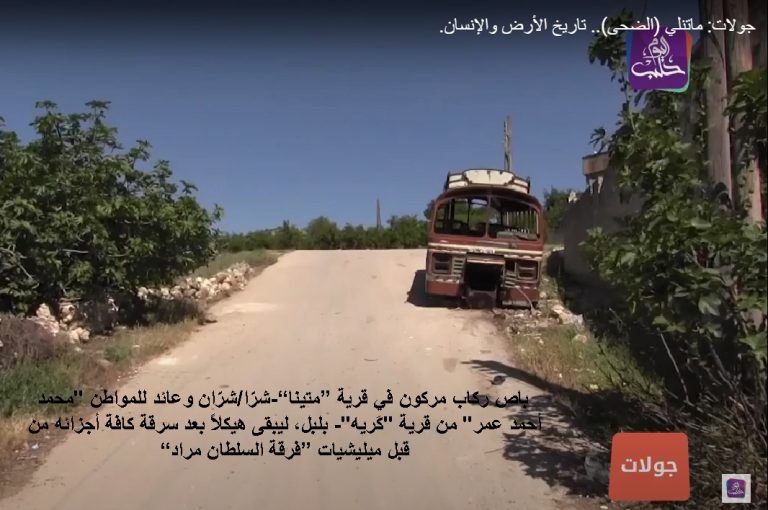كما سرقت /10/ جرارات زراعية مع ملحقاتها لـ”مصطفى جبولي، سليمان سليمان، مصطفى سليمان، حنان عبد الله، منان سيدو، إدريس حج أحمد، عيسى درويش،…..”، ومجموعة توليد كهربائية (أمبيرات) عائدة لـ”صبري محمد خليل”، و/4/ مجموعات توليد منزلية، و/8/ غطاسات آبار منزلية، ومجموعة ضخ مياه الشرب للشبكة العامة، ومجموعة ضخ مياه الشرب من بئر البلدية التي تم تجهيزها فيما بعد لأجل بيع المياه لصالح متزعم الميليشيا في القرية، وكذلك سرقت عدادات مياه الشرب، ومحوّلة وكوابل وقسم من أعمدة شبكة الكهرباء العامة، وكوابل وأعمدة شبكة الهاتف الأرضي وكبلها الضوئي الرئيسي الممتد من بلدة “شران” المجاورة، ومحتويات المدرسة الابتدائية التي تم تجهيزها فيما بَعد بشكلٍ متواضع، وخيمة مجالس العزاء ومستلزماتها وأجهزة الصوت من المسجد، وبعض تجهيزات معصرة زيتون، وكافة أجزاء باص ركاب مركون في القرية وعائد للمواطن “محمد أحمد عمر” من قرية “كَريه”- بلبل ليبقى هيكلاً.