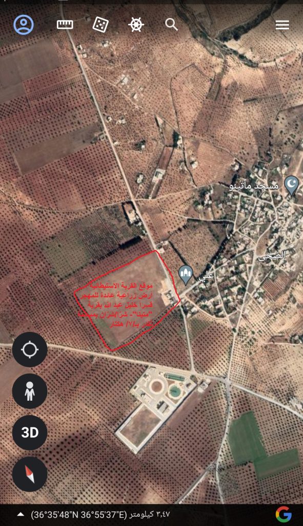 كما بُنيت قرية استيطانية نموذجية شمال غربي القرية مؤلفة من /60/ منزلاً تم إسكانها بحوالي /400/ نسمة من المستقدمين، ولا يزال البناء فيها مستمراً، على أرض زراعية مستولى عليها، تُقدر مساحتها بـ/7/ هكتارات وعائدة للمواطن المُهجَّر قسراً “خليل عبد الله”.