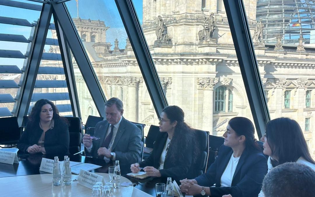عُقدت اليوم الأربعاء 4 آذار 2026 جلسة داخل البرلمان الألماني شاركت فيها الرئيسة المشتركة لدائرة العلاقات الخارجية، السيدة إلهام أحمد، وقائدة وحدات حماية المرأة، روهلات عفرين، إلى جانب عدد من النواب الألمان من مختلف الأحزاب، من بينهم بودو راميلو نائب رئيس البرلمان، وجانسو أوزدمير، وقاسم طاهر صالح، ولوكاس هوفمان، ولمياء خضور، وعلاء الحموي. وقد خُصصت الجلسة لبحث تطورات الأوضاع في شمال وشرق سوريا في ظل المرحلة الانتقالية الجارية.