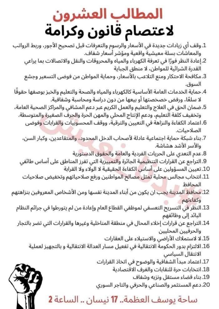 وأضاف البيان أن من بين المطالب حماية الخدمات العامة الأساسية كالكهرباء والمياه والصحة والتعليم والخبز بوصفها حقوقاً لا سلعاً، ورفض خصخصتها أو بيعها دون دراسة ومحاسبة وشفافية، إلى جانب ضمان جودة العلاج والتعليم والعمل الكريم عبر تحسين رواتب الكوادر الصحية والتعليمية، وتخفيف كلفة التعليم، ودعم الإنتاج المحلي والمهن الحرة والحرف الصغيرة والمتوسطة.