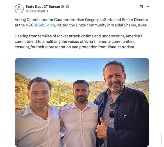قام القائم بأعمال منسق مكافحة الإرهاب غريغوري لوغيرفو، والمدير الأول في مجلس الأمن القومي سيباستيان غوركا، بزيارة الطائفة الدرزية في مجدل شمس بإسرائيل. واستمعا إلى عائلات ضحايا الهجمات الصاروخية، وأكدا التزام الولايات المتحدة بتعزيز أصوات الأقليات في سوريا وضمان تمثيلها وحمايتها من الإرهاب الجهادي.