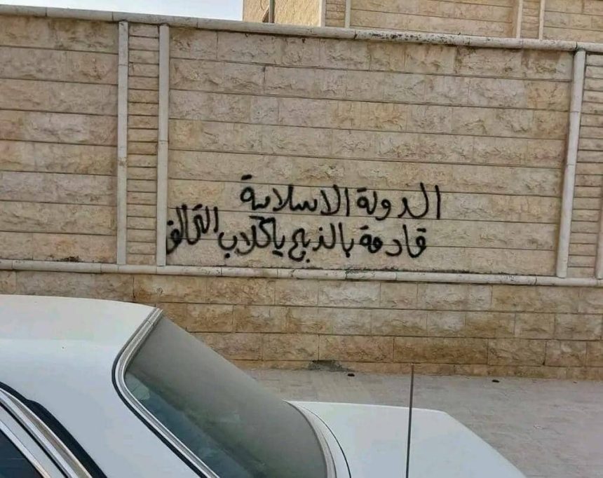 ظهرت كتابات ورسوم دعائية لتنظيم الدولة الإسلامية “داعش” على جدران عدة أحياء في مدينة حماة غرب سوريا، وشملت تهديدات مباشرة.