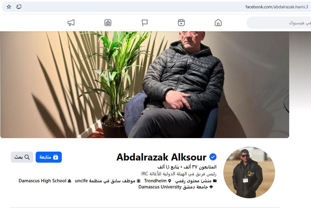 يظهر حساب المدعو عبدالرزاق الكسور (Abdalrazak Alksour)، الذي يعرّف نفسه كرئيس فريق في الهيئة الدولية للإغاثة (IRC) وموظف سابق في منظمات إنسانية، نشر محتوى يتضمن دعوات صريحة لعدم التعامل مع أبناء الطائفة العلوية والتحريض عليهم والإساءة لهم، في خطاب يحمل طابعاً إقصائياً وتمييزياً.