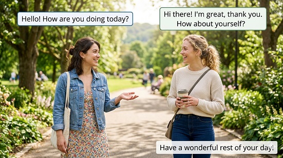 (أنا بخير، شكراً لسؤالك. إنه يوم جميل، أليس كذلك؟)