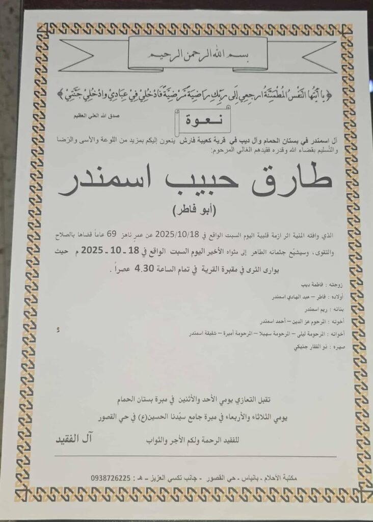 ملخص الحادث تُوفي العميد المتقاعد طارق حبيب اسمندر من الطائفة العلوية داخل أحد سجون السلطة المؤقتة (هيئة تحرير الشام) في المصدر: رايتس مونيتور (منصة مراقب حقوق الإنسان في سوريا) https://rightsmonitor.orgar – Rights Monitor