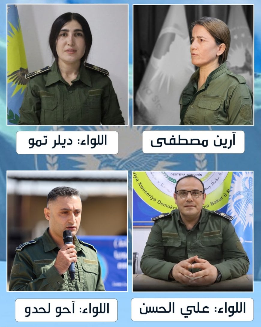 أما الوفد الأمني فضمّ القيادية في قوى الأمن الداخلي اللواء ديلر حسين تمو، والقيادي اللواء علي خضر الحسن، والقيادي اللواء مصطفى محمود دلي، والقيادي اللواء آحو أيليو لحدو، إضافة إلى نائبة الرئاسة المشتركة لهيئة الداخلية في الإدارة الذاتية الديمقراطية آرين مصطفى، الذين اجتمعوا مع وزير الداخلية أنس خطاب.