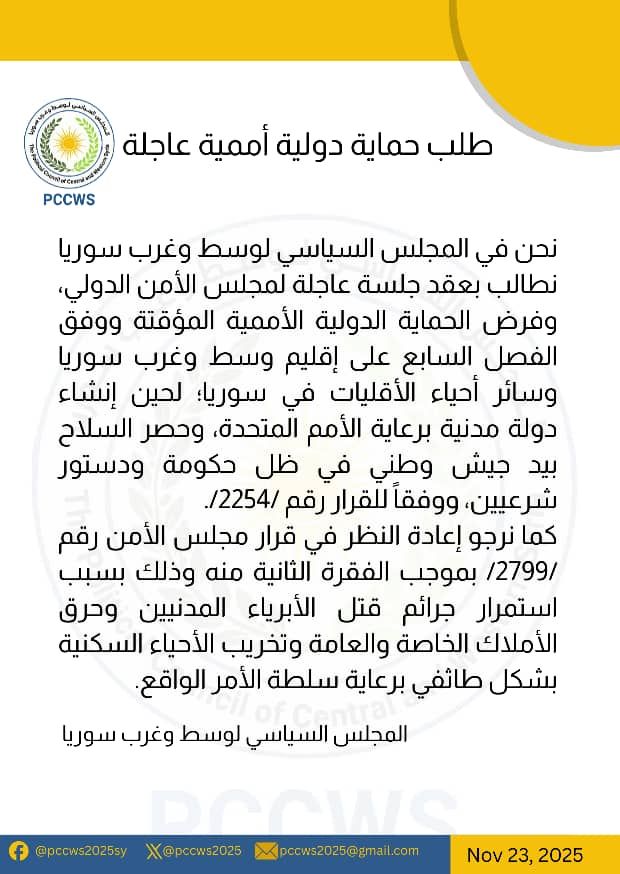 المجلس السياسي لوسط وغرب سوريا: طلب حماية دولية أممية عاجلة وعقد جلسة فورية لمجلس الأمن