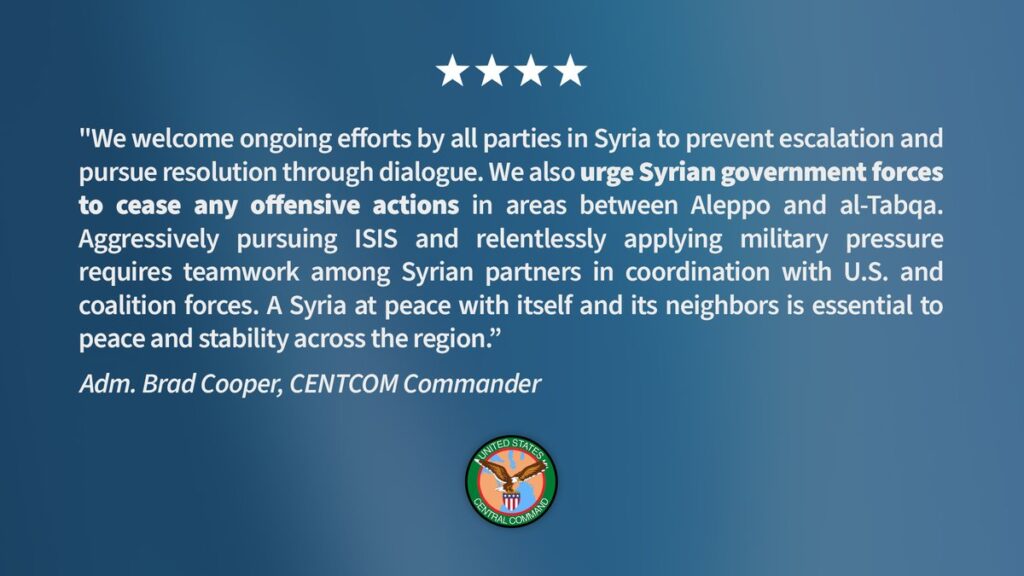 الجيش الأمريكي: نحثّ القوات الحكومية السورية على وقف أي أعمال هجومية في المناطق الواقعة بين حلب والطبقة